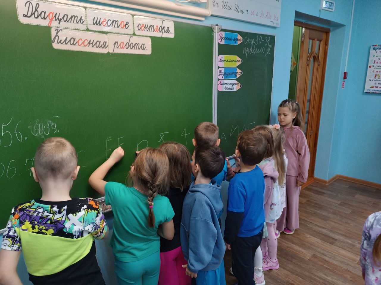 Во время визита маленькие дошкольники имели возможность наблюдать за уроком и побыть в роли школьника, написав буквы на школьной доске. Ребята с интересом рассматривали учебные материалы.